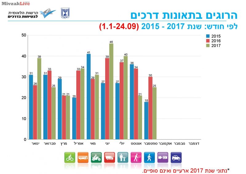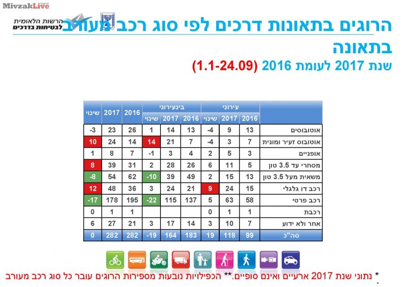 הרשות הלאומית לבטיחות בדרכים מפרסמת היום (ראשון) סיכום נתוני תאונות הדרכים מתחילת עד השנה ועד היום. על פי הנתונים מספר ההרוגים בתאונות דרכים מתחילת השנה עד עכשיו עומד על 282 בני אדם, מספר זהה למספר ההרוגים בכל שנת 2016.