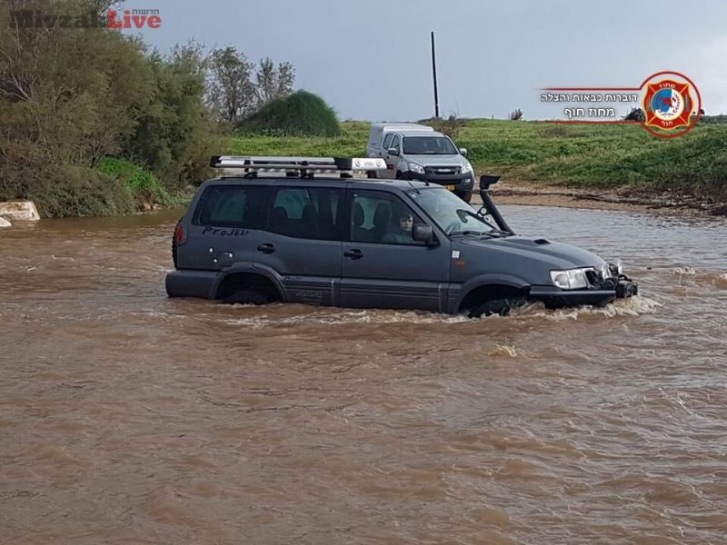 צוותי חילוץ פועלים לסייע לשני ג'יפים שנלכדו במים בנחל חילזון