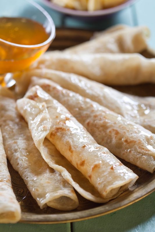• לשטח כל כדור בצק, למתוח עם כף היד לצורת עיגול דק מאוד, בגודל המחבת שלכם