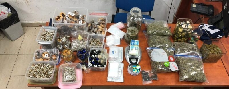 בלשי המשטרה ערכו חיפוש בבית החשודה, במהלכו נמצאו חומרים שונים החשודים כסם: "עוגיות חשיש", מאות בקבוקים המכילים "שמן קנאביס" ומאות גרמים של "פטריות הזיה" וכן חשיש ומריחואנה במשקל כולל של 1 ק"ג. בנוסף, תפסו הבלשים ברשותה עשרות אלפי ש"ח במזומן, החשודים כפדיון הסחר הסמים.