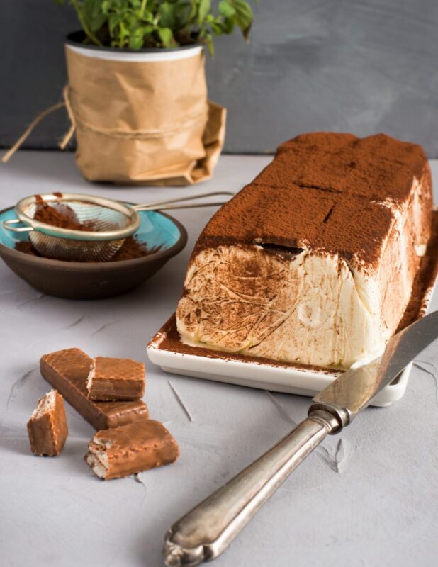 2. מקפיאים. מוציאים מהמקפיא והופכים על צלחת הגשה. מסירים את הניילון הנצמד, בוזקים אבקת קקאו, פורסים ומגישים לאחר 10-20 דקות בטמפ׳ חדר.