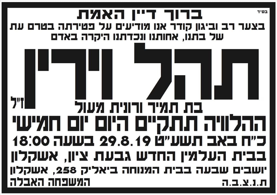 שתי האחיות, ירין בת ה-19 ותהל בת ה-17 ז"ל יובאו הערב (חמישי) בשעה 18:00 למנוחות בבית העלמין החדש גבעת ציון באשקלון. האחיות נהרגו הלילה בתאונת דרכים שאירעה ברחוב התחייה באשקלון. הרכב בו נסעו איבד שליטה והתנגש בעץ על אי התנועה ברחוב.