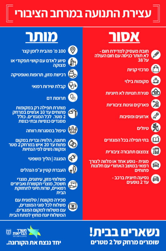 על פי תקנות החירום החדשות לא ניתן יהיה לצאת ממקום מגורים או ממקום שהייה קבוע למרחב הציבורי אלא לאחת מהפעולות או המטרות הבאות: