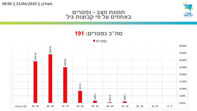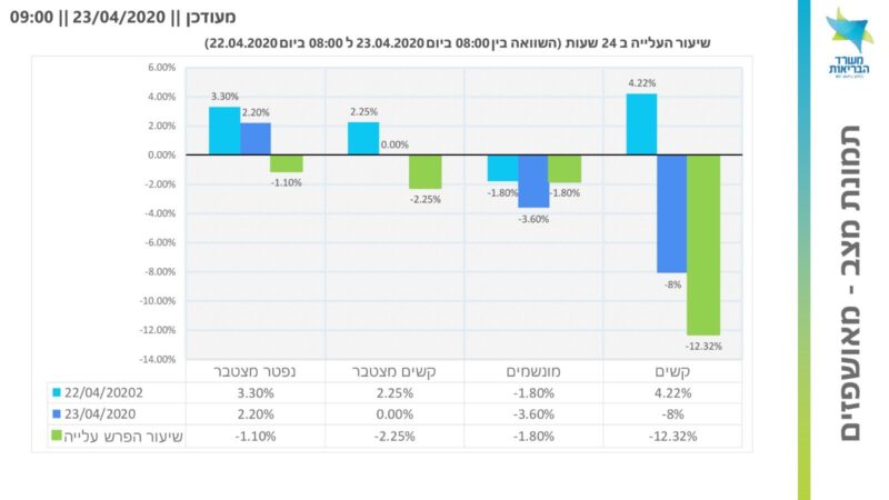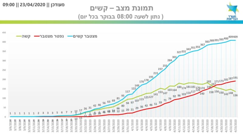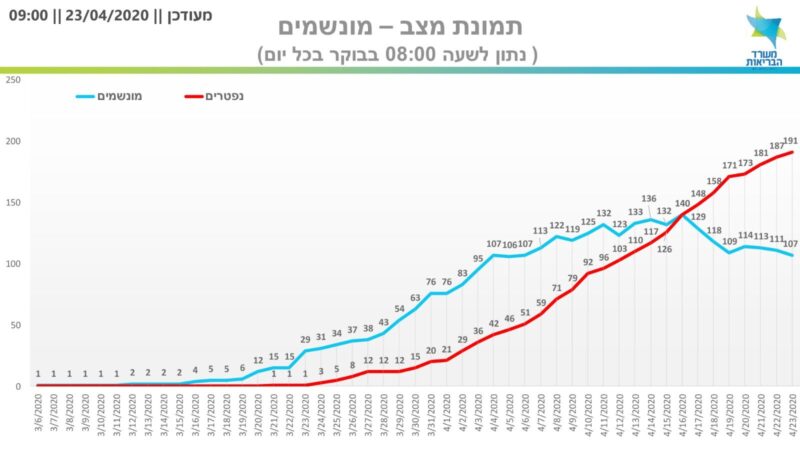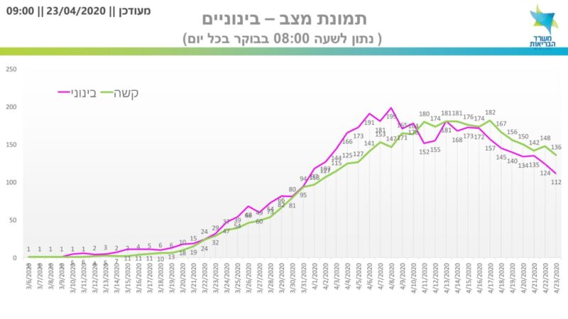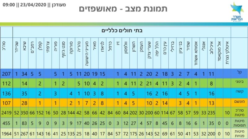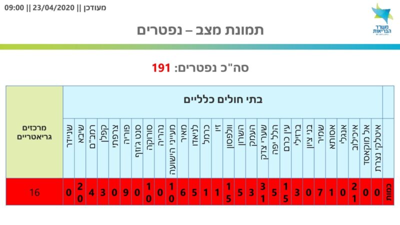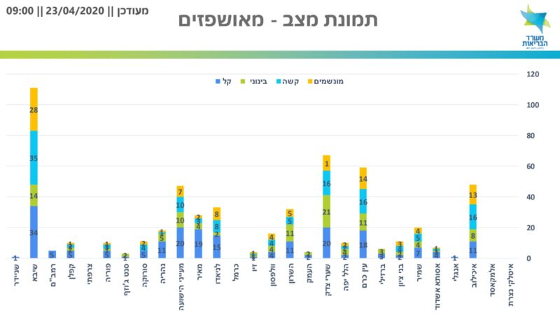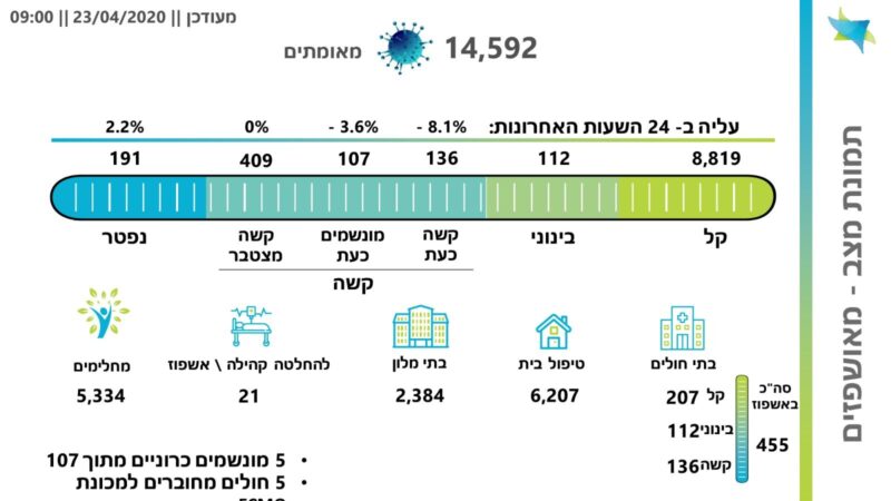 משרד הבריאות מעדכן הבוקר (חמישי) כי נכון לשעה 09:00 אובחנו עד כה בישראל – 14,592 חולי קורונה, מתוכם 191 חולים נפטרו מסיבוכי הנגיף, 136 במצב קשה מתוכם 107 מונשמים, 112 באורח בינוני ו-8,819 במצב קל.