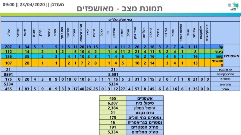 בבתי החולים מאושפזים 455 חולים, 6,207 מטופלים בביתם, 2,384 בבתי מלון ייעודיים ולגבי 21 חולים טרם נקבעה מסגרת אשפוז. עד כה החלימו 5,334 מטופלים.