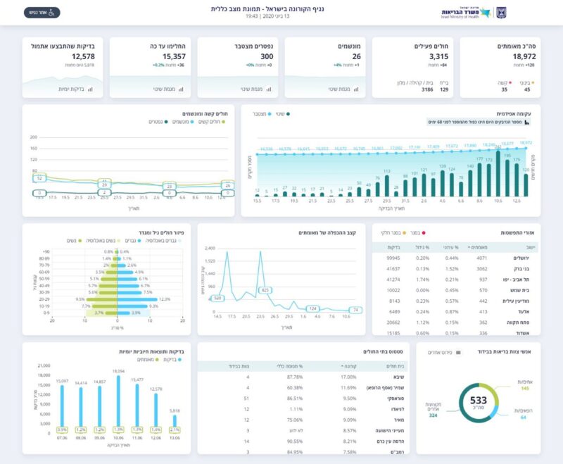 משרד הבריאות מעדכן הערב (מוצ"ש) כי נכון לשעה 19:43 אובחנו עד כה בישראל – 18,972 חולי קורונה (120 חולים נוספו מחצות), מתוכם יש 3,315 חולים פעילים. 300 בני אדם נפטרו מסיבוכי הנגיף (ללא שינוי מחצות), 35 במצב קשה, מתוכם 26 מונשמים (1 נוסף מחצות), 45 באורח בינוני והיתר במצב קל.