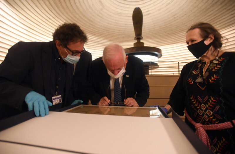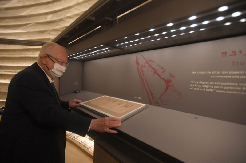 נשיא המדינה ראובן (רובי) ריבלין הגיע היום (רביעי) למוזיאון ישראל, ללוות את מעמד השבת המגילות הגנוזות מהכספת אל התצוגה בהיכל הספר. המגילות אוחסנו בחדר המוגן חודשים ארוכים עקב מגפת הקורונה והן יוצגו מחדש לקהל הרחב עם פתיחת המוזיאון למבקרים ביום חמישי הקרוב. הנשיא המלווה במנכ"ל מוזיאון ישראל פרופ' עידו ברונו ובאוצר ומנהל היכל הספר ד"ר אדולפו רויטמן, משמרת המגילות חסיה רימון, ואוצרת המגילות חגית מעוז, צפה בהוצאה המאובטחת של המגילות מהכספת ובהצבתן מחדש בארונות התצוגה. הנשיא גם קבע את שלט ההסבר לצד מגילת המקדש.