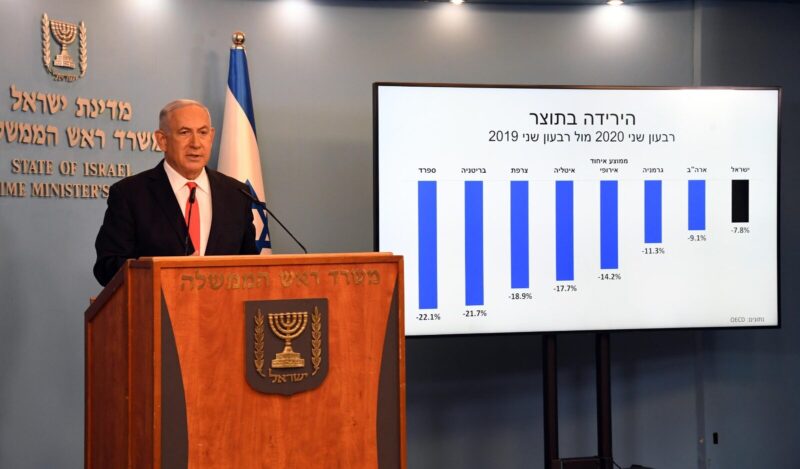 נתניהו הדגיש את מצבה של ישראל מול מדינות אחרות בעולם, "אני יודע שיש עוד המון בעיות ויש קשיים, ואנחנו עובדים בלי סוף כדי לעזור לכם, אזרחי ישראל. אבל חשוב לי להראות לכם מה קורה כאן. התכווצות הירידה בתוצר – תראו איפה נמצאת ישראל. ארה"ב, גרמניה במצב יותר קשה, ממוצע האיחוד האירופי כמעט כפליים מאיתנו – איטליה, צרפת, בריטניה, ספרד. כלומר, זה שפתחנו מוקדם את הכלכלה ופתחנו אותה מהר, היה לזה צעד כלכלי מובהק. ההחלטה שלנו הביאה לכך שיש לנו פחות חולים קשים, פחות נפטרים ופחות פגיעה בכלכלה ביחס לעולם. אבל כשפתחנו את הכלכלה, בסוף מאי, אני אמרתי, ואני מצטט את עצמי: "זה יהיה כמו אקורדיון, פותחים כשהתחלואה יורדת, מכווצים כשהתחלואה עולה". וזה בדיוק מה שקורה עכשיו בכל העולם, בכל המדינות האלה, וגם במדינות אחרות. באוסטריה ובאוסטרליה, בספרד ובצרפת, בגרמניה ובריטניה, בכל המדינות הם פתחו, התחלואה עלתה, ואז הם מתחילים להגביל ולסגור. באזורים מרכזיים באוסטרליה, במדינה כמו ויקטוריה, שהיא כמעט בגודל של מדינת ישראל פשוט הנהיגו סגר, כך בניו-זילנד, בספרד, אזורים שלמים שנמצאים כבר בסגר של הגל השני."