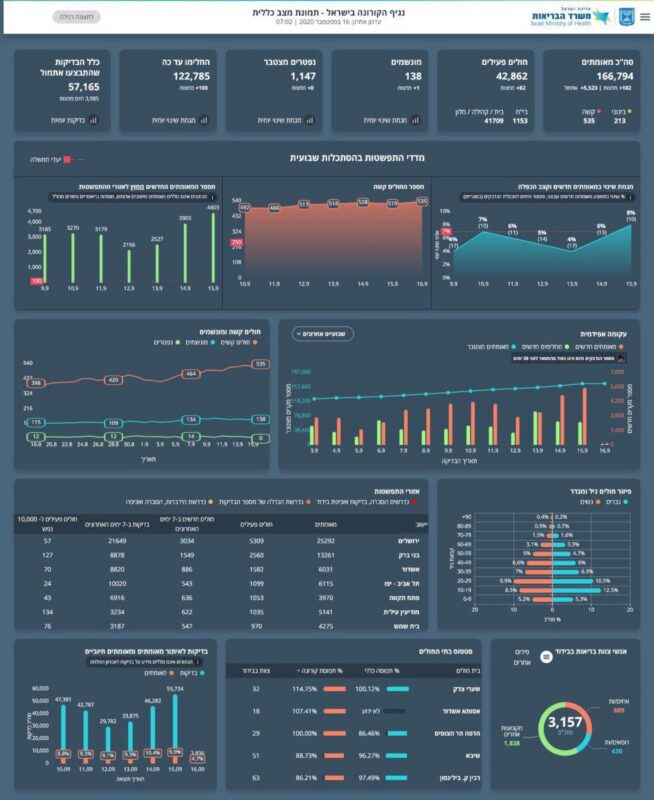 משרד הבריאות עדכן היום (רביעי) כי 5,523 חולים מאומתים אובחנו מאתמול, ו- 166,794 מאובחנים מפרוץ המגיפה. נעשו 57,165 בדיקות, ישנם 535 חולים המוגדרים במצב קשה, ו- 138 מונשמים. 1,147 בני אדם הלכו לעולמם מפרוץ המגיפה. 57,165 תוצאות בדיקות התקבלו אתמול.