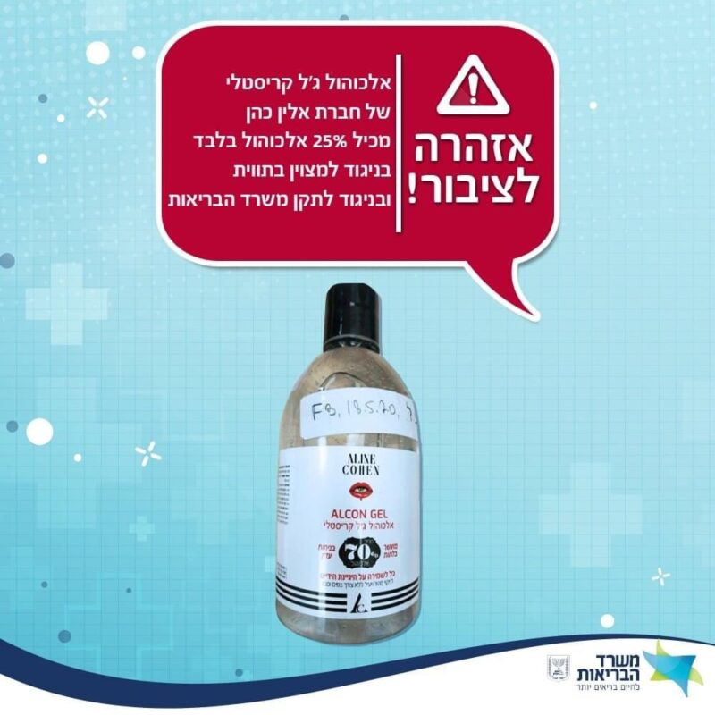 משרד הבריאות: לא לרכוש ג'ל חיטוי של "אלין כהן – אלכוהול ג'ל קריסטלי"
