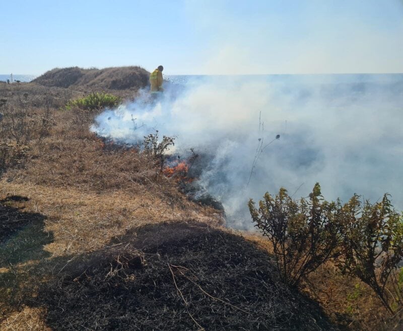 שבעה צוותים מתחנת כיבוי חיפה פועלים בשעה האחרונה (ראשון) בכבוי שריפת קוצים בקו החוף מאזור בת גלים לכיוון מתקן חקר ימים הסמוך לחוף.