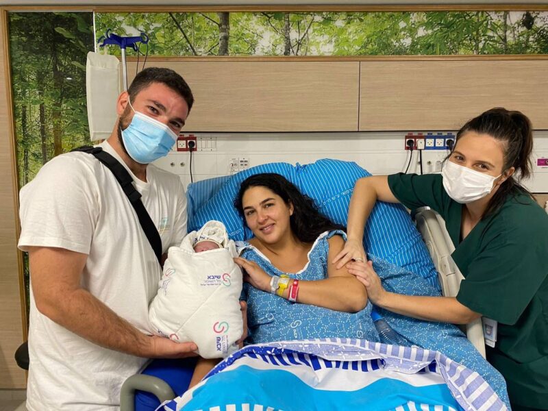 בתמונה: אריאל קדוש, בעלה דביר ובנם הראשון יחד עם המיילדת רות לימון.
