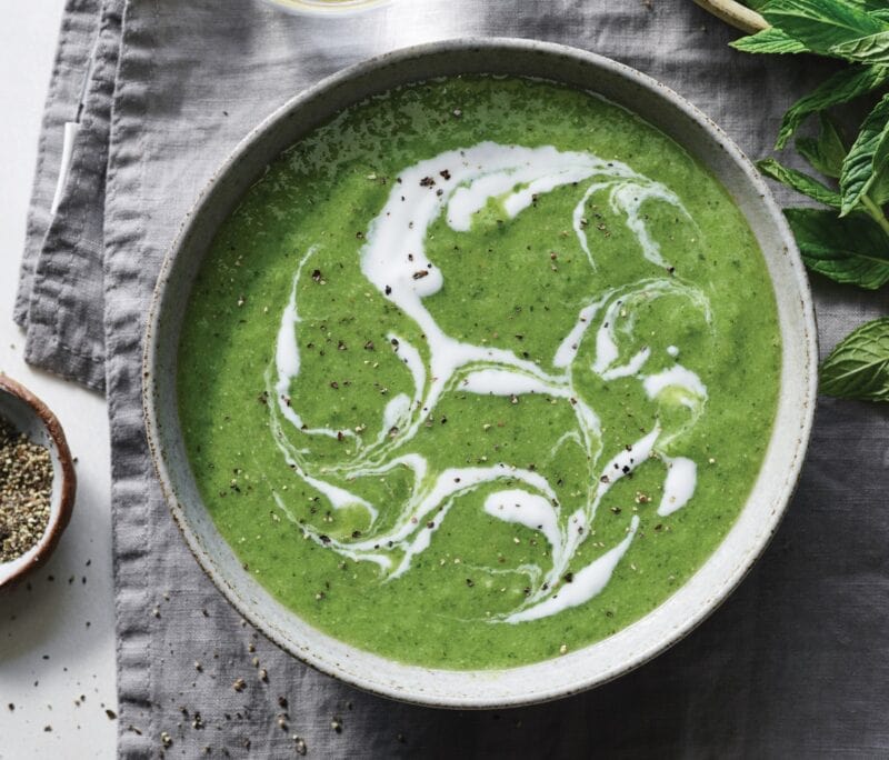 מניחים את הבצל הירוק והאפונה בבלנדר, יוצקים פנימה את המים, עלי הנענע ואבקת החלבון ומערבלים למרק חלק.