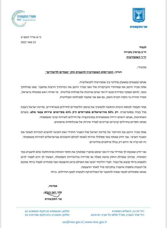 בסיום כתב: "אני יודע שאכפת לך מחיילי צה"ל ואני שומע מחברי מפלגתך את חוסר הנוחות מההחלטה שלא להצביע בעד המתווה. מכיוון שנפילת החוק איננה מעלה או מורידה בהישרדות הממשלה, הצעתי לך היא לעצור לרגע ולמצוא ביחד מוצא של כבוד. חברי הליכוד יעזבו את האולם ברגע ההצבעה ואני מתחייב לעבוד ביחד אתכם על הטבות נוספות שיעברו בחקיקה מיד לאחר ההצבעה. אנחנו מסוגלים לכמה שעות להתגבר על הפוליטיקה ולעשות למען החיילים. ביחד."