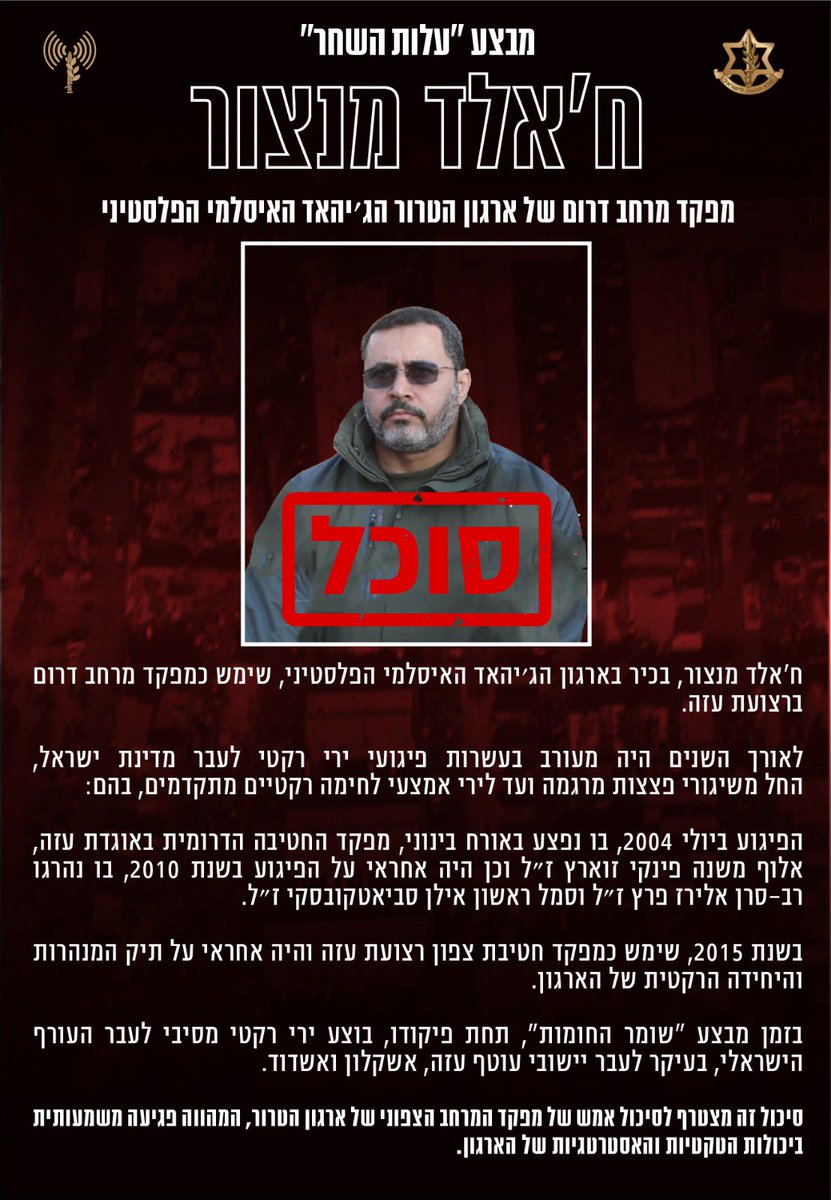סיכול בכיר נוסף בג'יהאד האיסלאמי הפלסטיני:מטוסי קרב פגעו אמש בבכיר בארגון הגא"פ, ח'אלד מנצור, מפקד מרחב דרום ברצועת עזה. דרגתו של ח'אלד מנצור מקבילה לדרגת גנרל. הפעולה אושרה על ידי ראש המטה הכללי, שר הביטחון וראש הממשלה >> https://t.co/dmPLGjHS6U pic.twitter.com/wUScArVjao