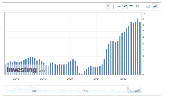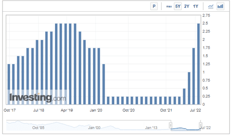 מגרף זה ניתן לראות כי הריבית זינקה מ- 0.25% בתחילת 2022 לריבית של 2.5% , כאשר הצפי היא לעלייה נוספת של 0.5-0.75% בעדכון הקרוב בספטמבר , עליית ריבית כה עוצמתית לא הייתה עשרות שנים וזאת בכדי להילחם באינפלציה שהגיעה לרמות שלא ראינו מאז שנות ה- 80 בארה"ב.