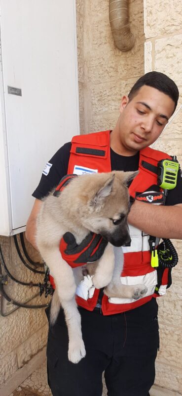 רשף נח יונה קצין כבאות והצלה שחילץ את הכלב: "נקראנו לדירה, ברחוב מאיר גרשון בשכונת פסגת זאב, לחלץ גור כלבים קטן שראשו נלכד, הגענו תוך זמן קצר וחילצנו אותו עם ציוד חילוץ ייעודי, ללא פגע תוך כדי שאנחנו מרגיעים אותו ואת בעליו שחששו לשלומו."