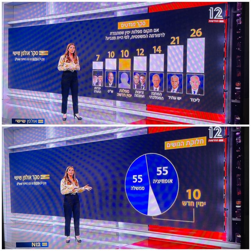 עוד עולה מהמסקר של אולפן שישי ומנו גבע בערוץ 12, כי אם הייתה מוקמת מפלגת ימין חדשה שמתנגדת למהפכה המשפטית היא הייתה מקבלת 10 מנדטים.