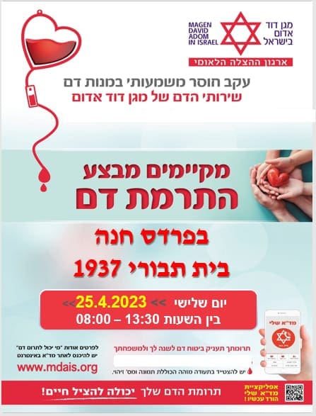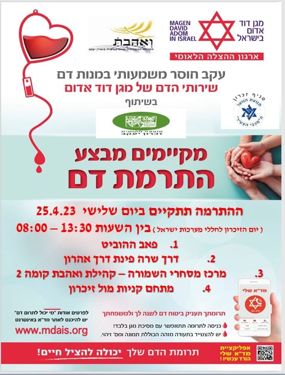 התרמת הדם תתקיים ביום הזיכרון לחללי מערכות ישראל ונפגעי פעולות האיבה, יום רביעי (25.4.23) בין השעות 08:00-13:30, בארבעה מוקדים שונים בזיכרון יעקב: במרכז מסחרי השמורה באולם קהילת ואהבת בקומה 2, בפאב 'הוביט' במדרחוב, בדרך שרה פינת דרך אהרון ובניידת התרמה 'במול זכרון' על כביש 4. בנוסף תתקיים התרמת דם גם בבית תבורי 1937 ברחוב גלעד 3 פרדס חנה בין השעות 08:00-13:30. את התורמים הרבים הצפויים להגיע גם השנה, יקבלו צוותי מתרימי הדם משירותי הדם של מגן דוד אדום.