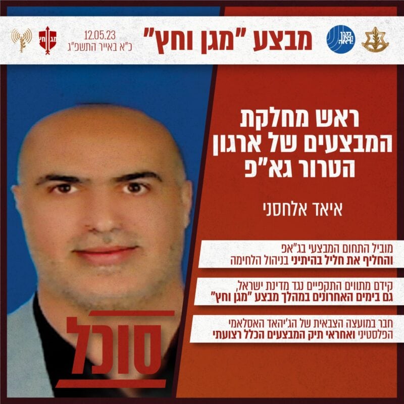 במבצע משותף עם שב"כ, צה"ל תקף לפני זמן קצר (שישי) וסיכל בדירת מסתור, בכיר בארגון הטרור הג'יהאד האסלאמי הפלסטיני, איאד אלחסני, מפקד תיק המבצעים של הארגון בכלל הרצועה.