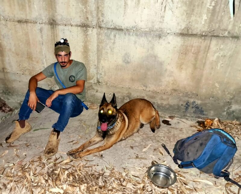 צילום באדיבות יחידת הכלבנים: תמונה של הכלבן דוד עבדי, ביחד עם הכלבה "דנה" בתום החיפושים אחר הנעדר.