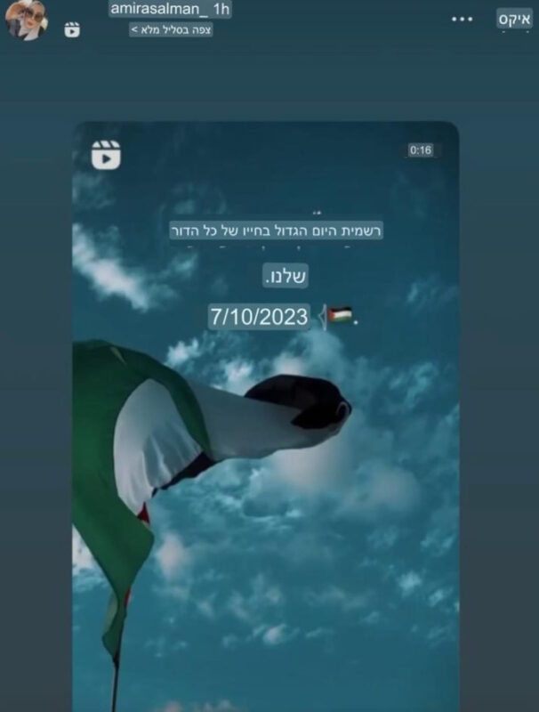 השבוע פרסמה עובדת בכירה בעיריית ירושלים אמירה סלמאן סטורי ובו היא כתבה "07.10.23 רשמית זה היום הגדול בחייו של כל הדור שלנו". לפרסום היא צירפה דגל פלסטין.