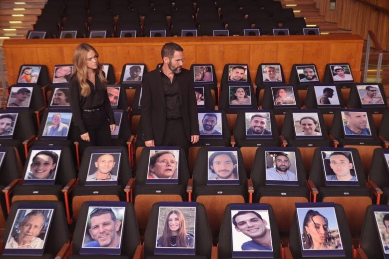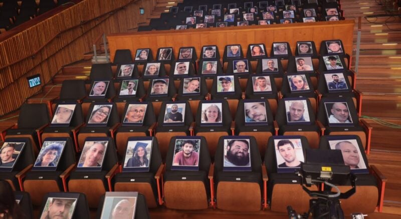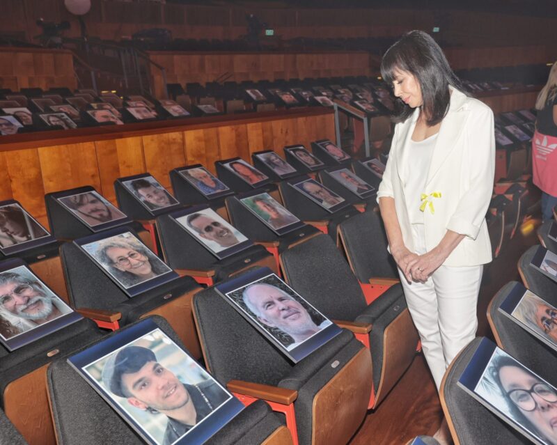 תמונות החטופים הוצבו על הכיסאות באולם בהיכל התרבות.