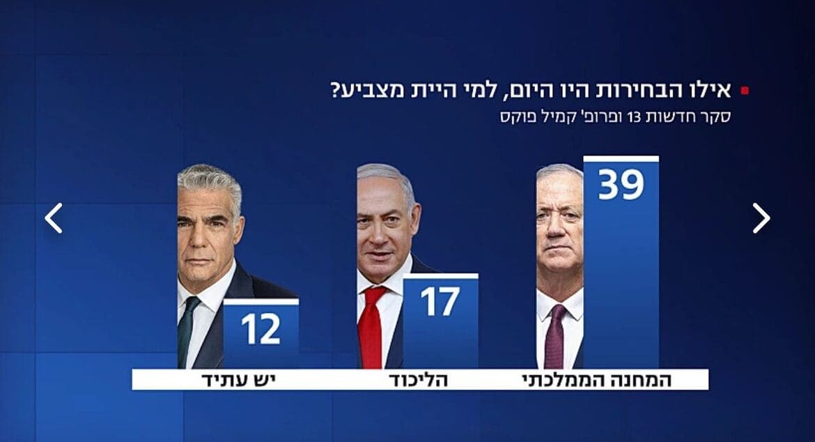 מנתוני סקר חדשות 13 שפורסם הערב (ראשון) עולה כי הפער בין המחנה הממלכתי לליכוד ממשיך לגדול, ואם הבחירות היו נערכות היום מפלגתו של בני גנץ הייתה זוכה ל-39 מנדטים לעומת 17 מנדטים בלבד למפלגת הליכוד של ראש הממשלה בנימין נתניהו. את הסקר עבור חדשות 13 ששודר הערב במהדורה המרכזית ערך הפרופסור קמיל פוקס .לפי הסקר, גם מפלגת יש עתיד של יאיר לפיד ממשיכה להיחלש וזוכה ל – 12 מנדטים בלבד.