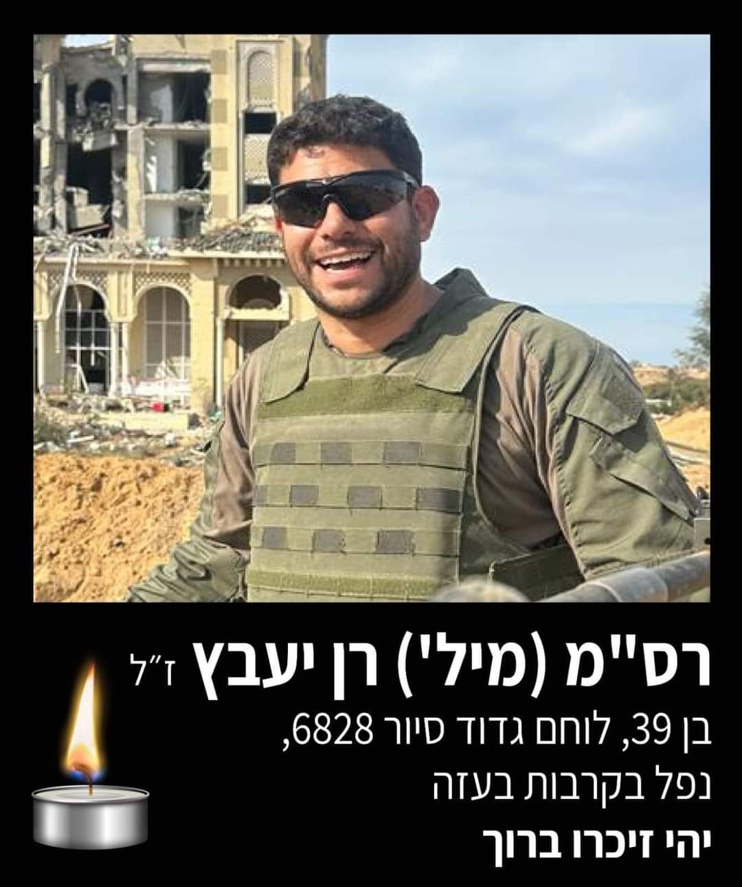 החלל: רס״ם (מיל׳) רן יעבץ ז"ל (Ran Yavetz), בן 39, ממודיעין, לוחם בגדוד סיור 6828, חטיבת ביסל״ח (828), נפל במהלך פעילות מבצעית בעוטף עזה.