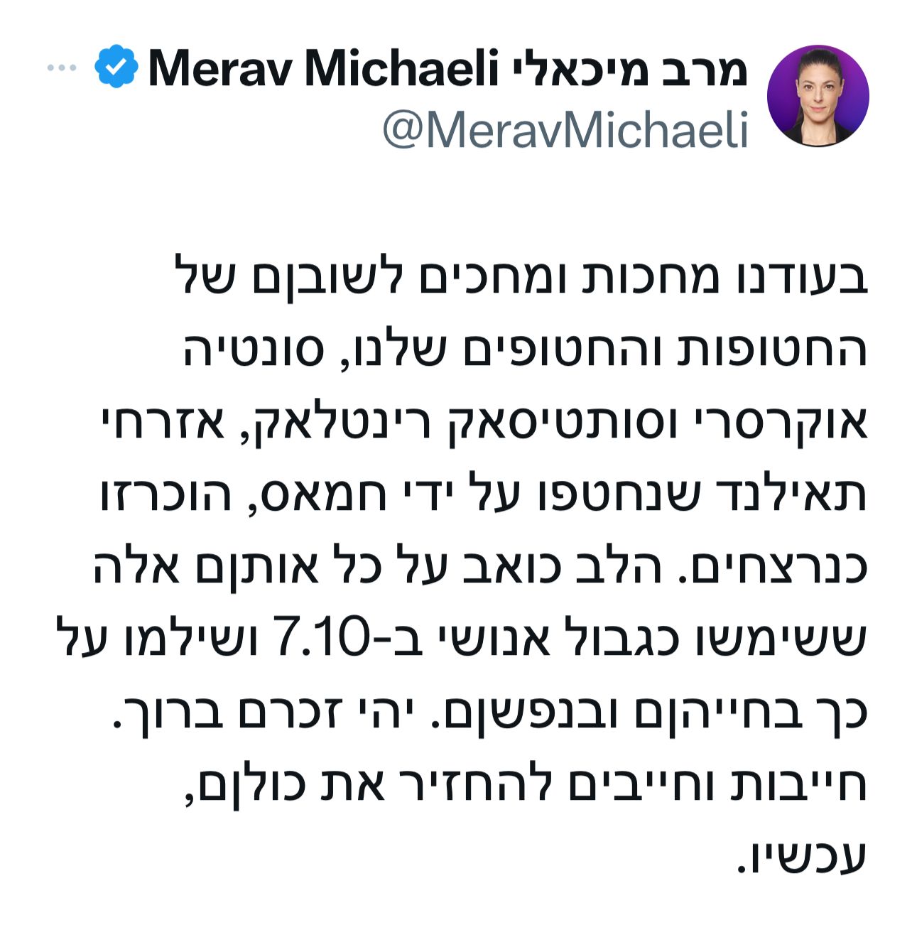 יו״ר מפלגת העבודה, ח״כ מרב מיכאלי פרסמה לפני זמן קצר (חמישי) בחשבון הטוויטר שלה בעקבות הפרסום שהחטופים התאילנדים שנרצחו בטבח השביעי באוקטובר: