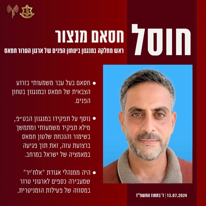 צה״ל חיסל, באמצעות מטוסי קרב של חיל האוויר ובהכוונה מודיעינית של אמ״ן, את המחבל, חסאם מנצור, ראש מחלקה במנגנון ביטחון הפנים של ארגון הטרור חמאס.