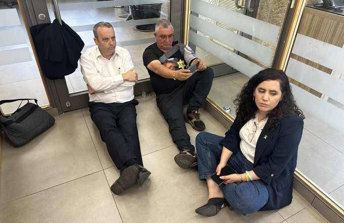 ח"כ גלעד קריב (עבודה) פרסם ב-X לפני זמן קצר (שני), תמונה שלו יושב על הרצפה בכניסה לכנסת יחד עם דני אלגרט, אחיו של החטוף איציק אלגרט, וח"כ נעמה לזימי (עבודה), במחאה על מניעת כניסתו של אלגרט למשכן.